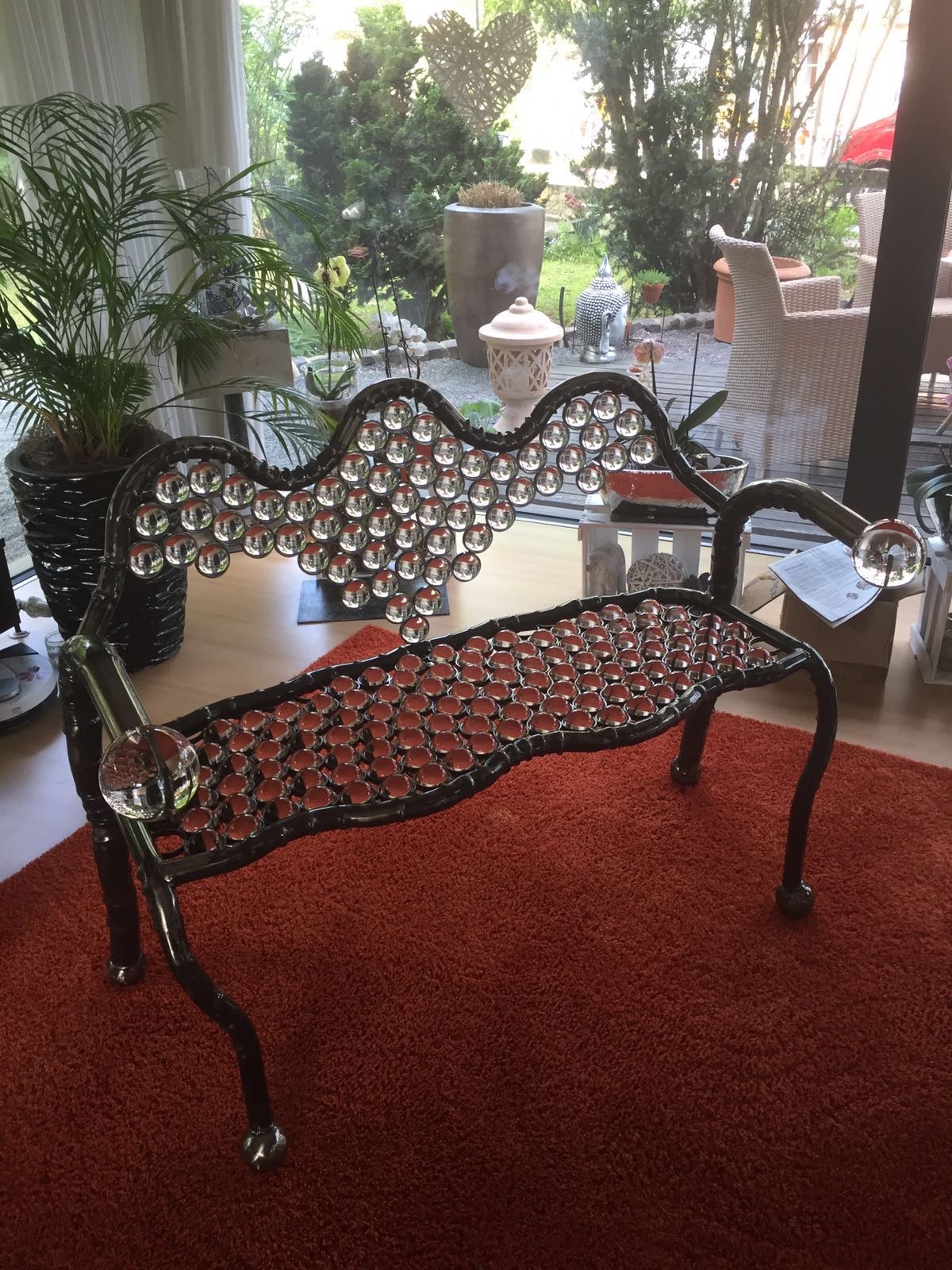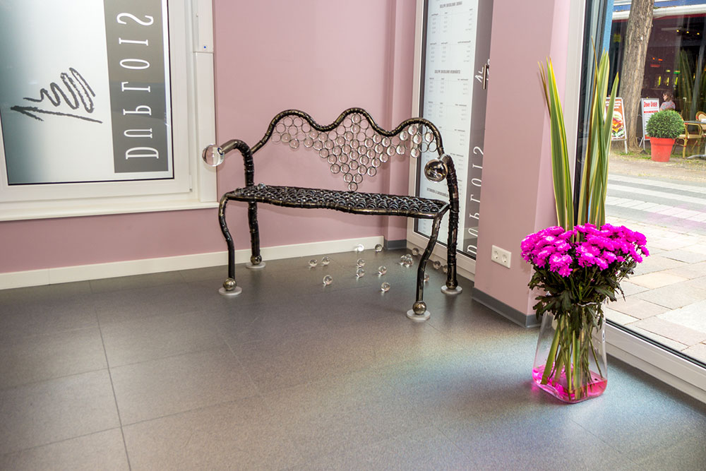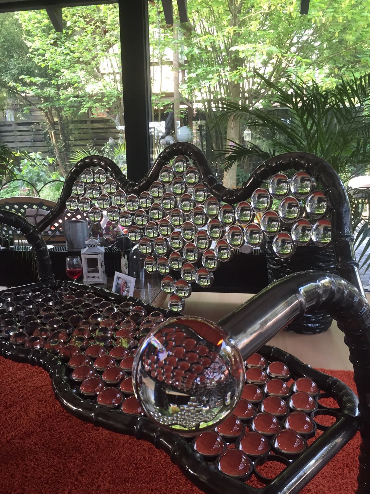 Diese einzigartige Sitzbank enthält insgesamt 179 Kristallkugeln. Davon 177 50mm Kugel und zwei 100 mm. Und damit bringt sie stolze 50 Kg auf die Waage. Einmaliger kann man wohl kaum sitzen.