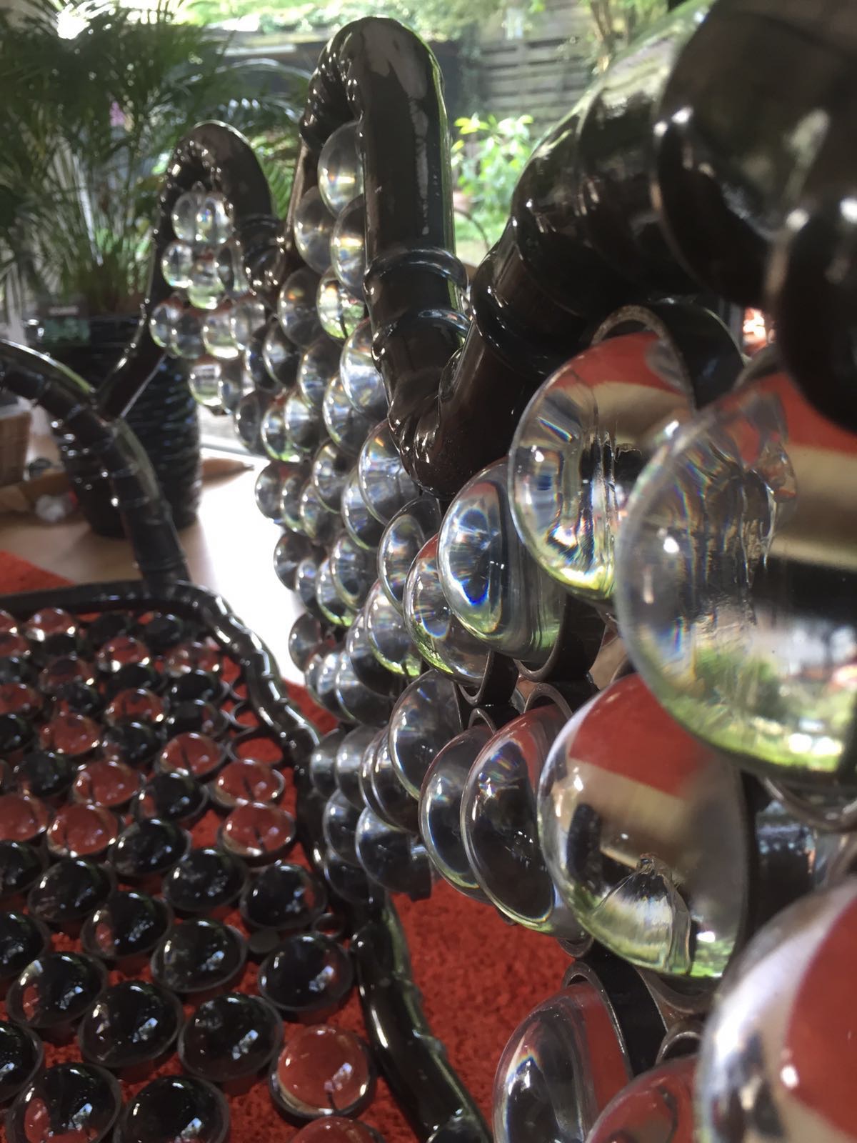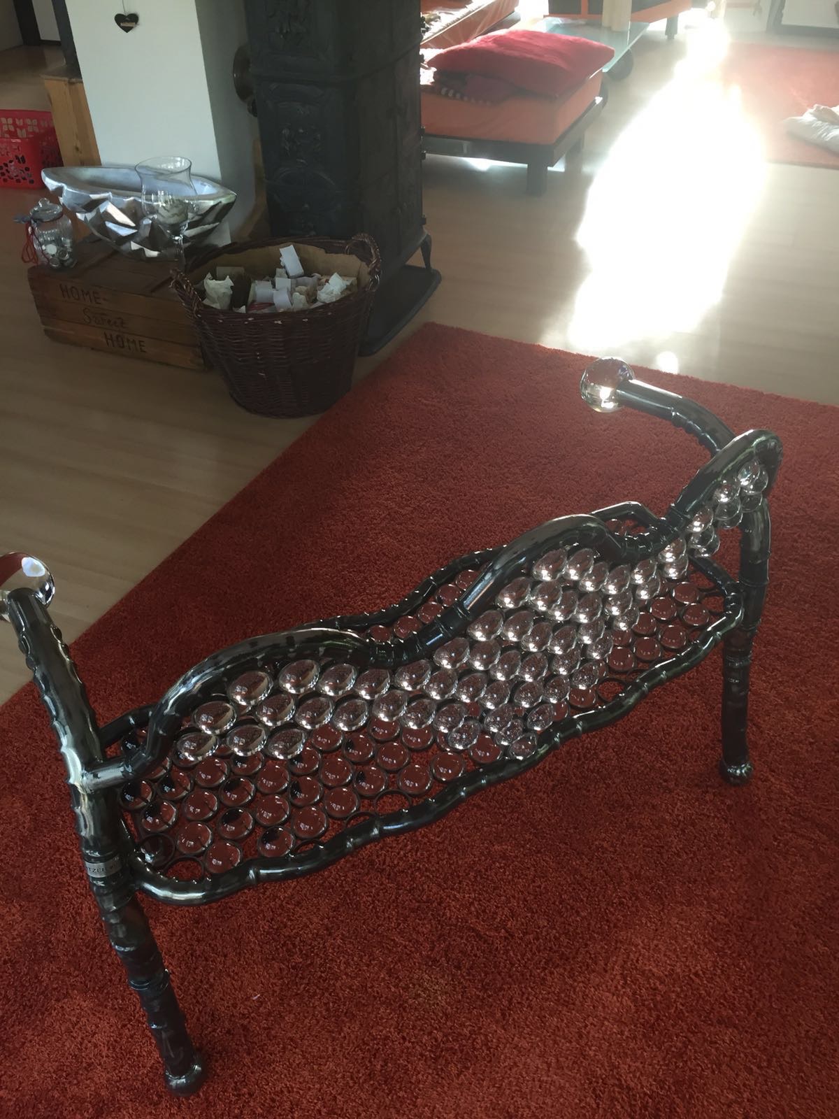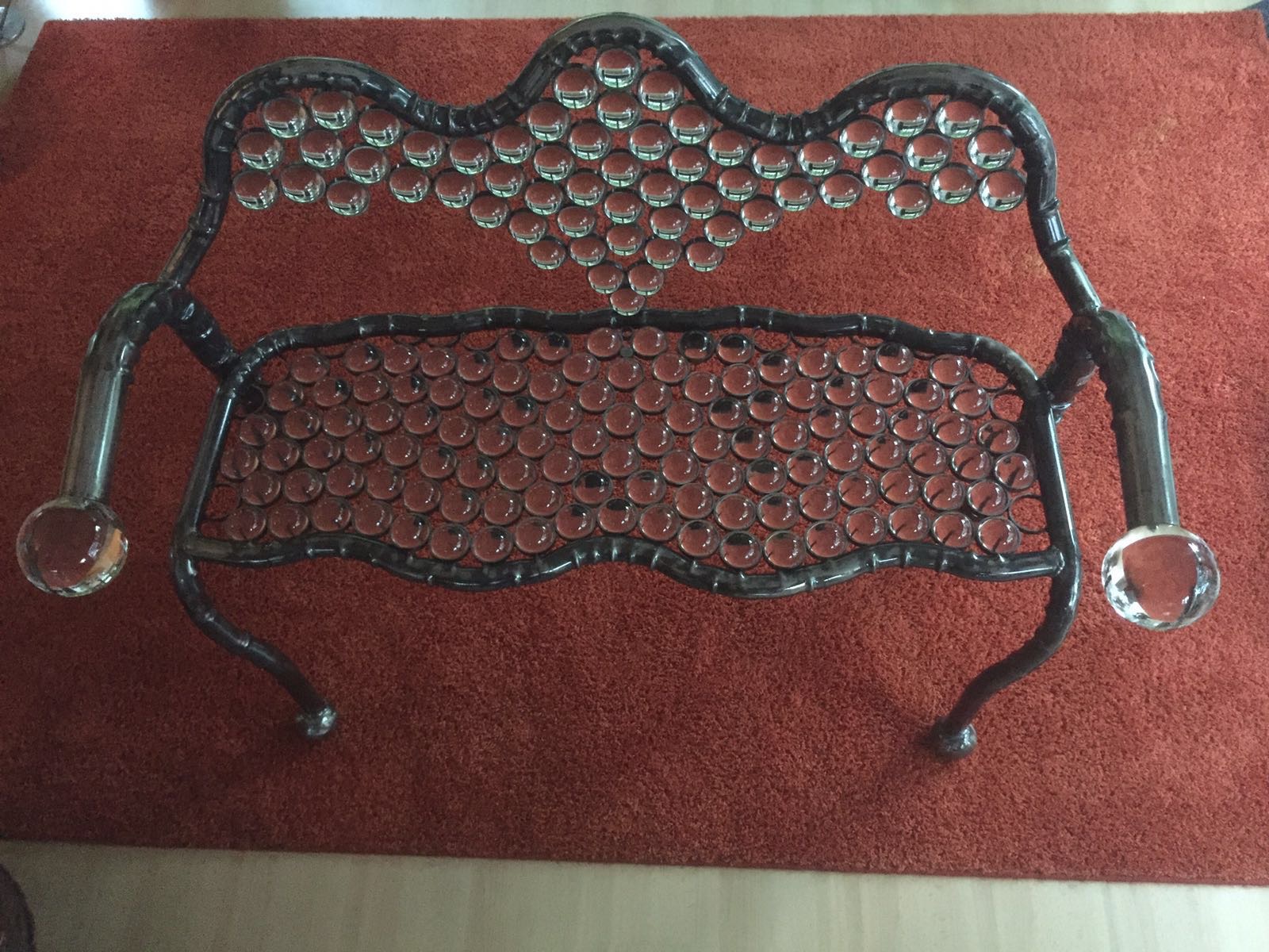 Diese einzigartige Sitzbank enthält insgesamt 179 Kristallkugeln. Davon 177 50mm Kugel und zwei 100 mm. Und damit bringt sie stolze 50 Kg auf die Waage. Einmaliger kann man wohl kaum sitzen.