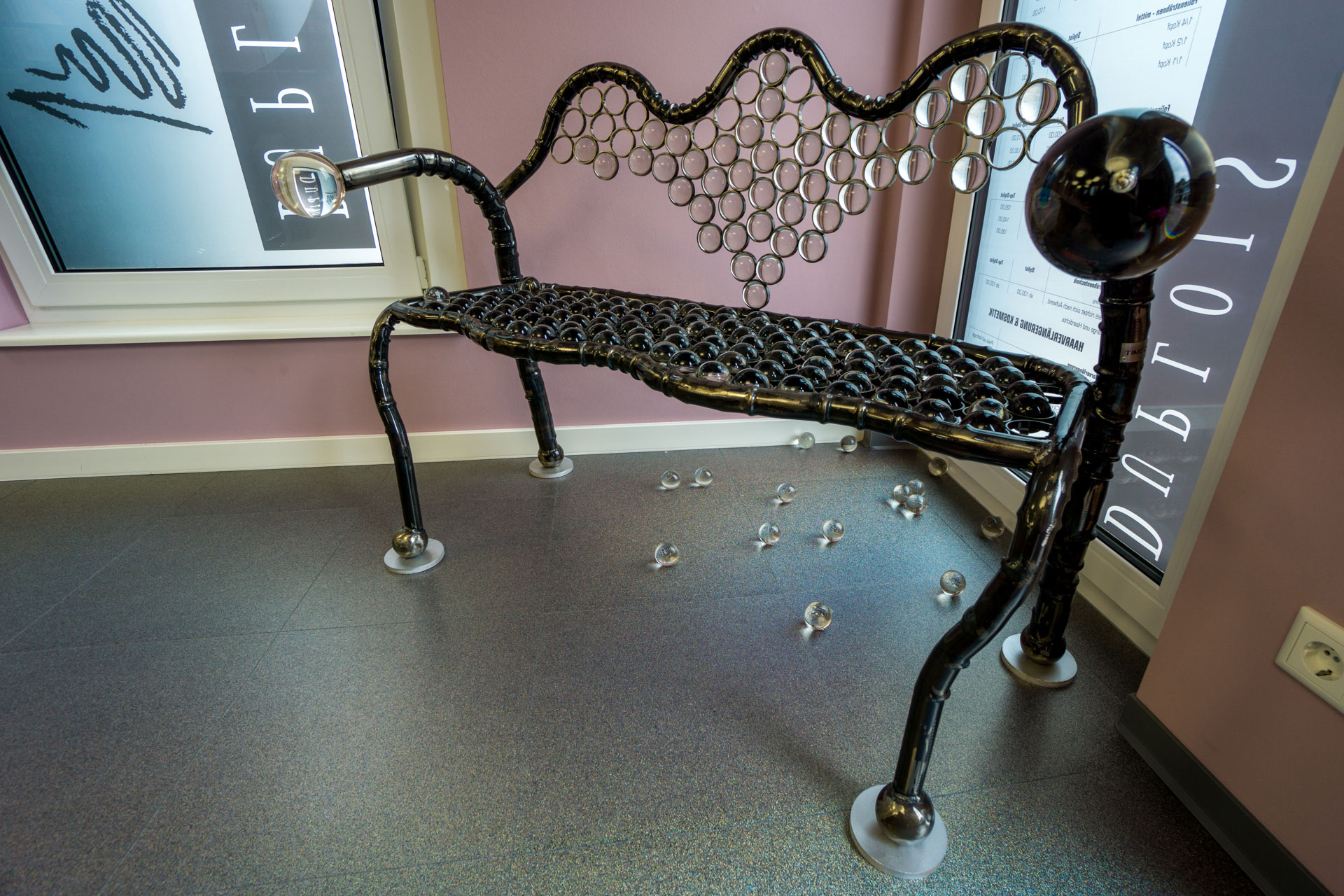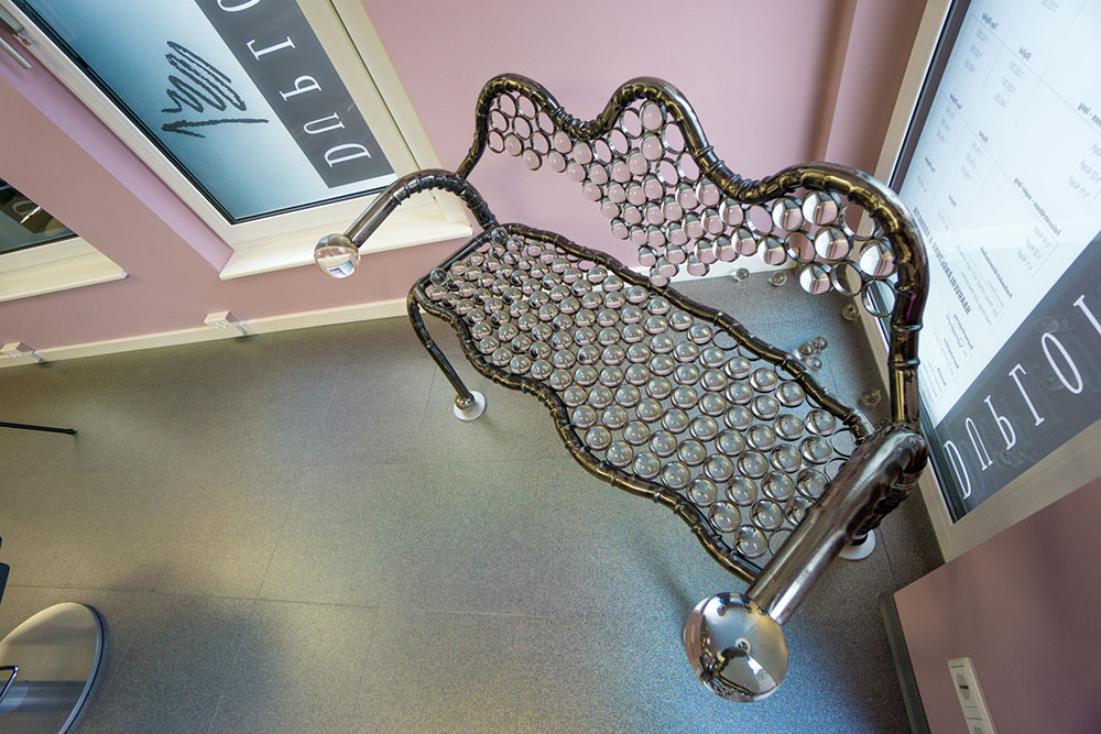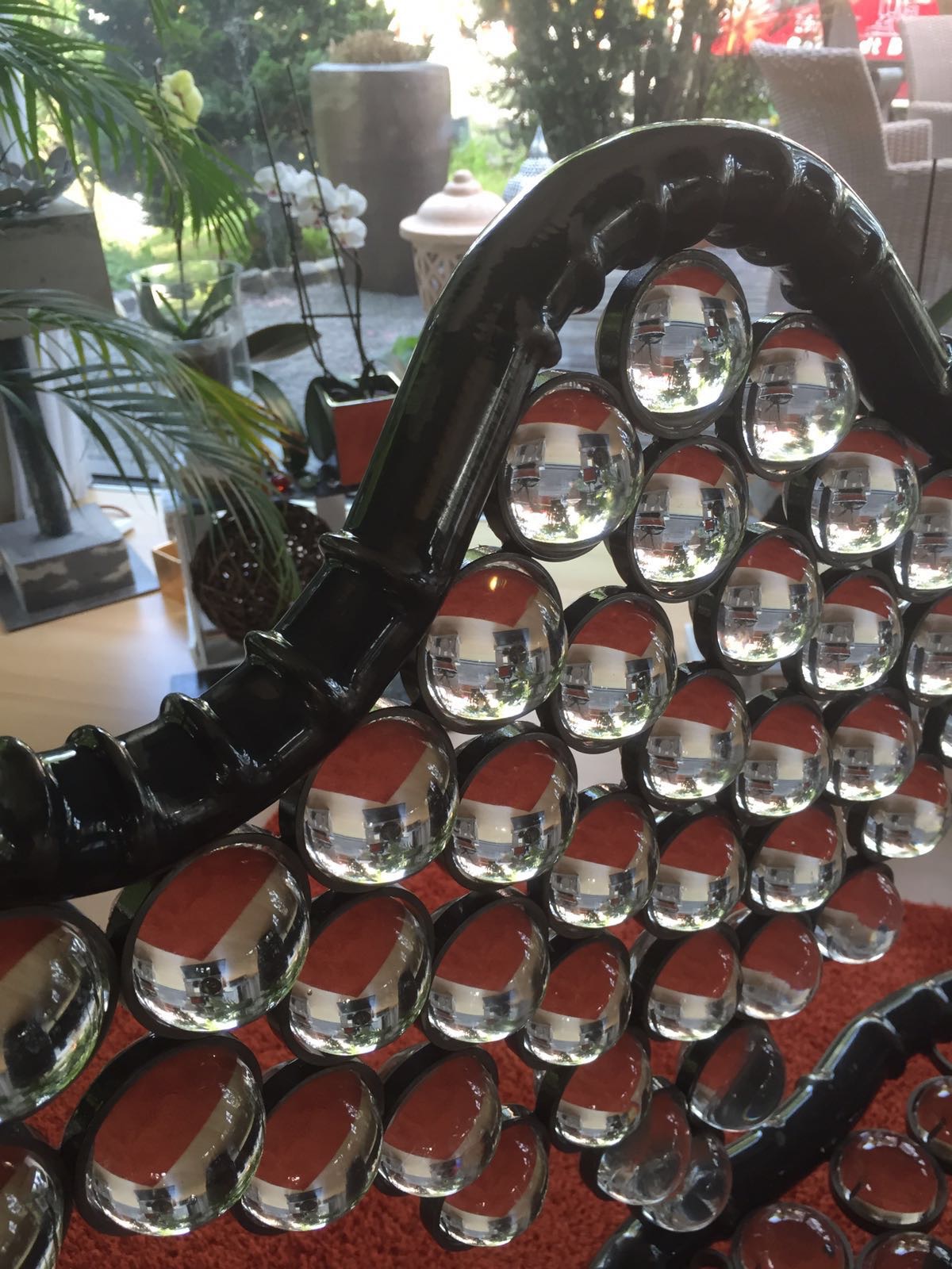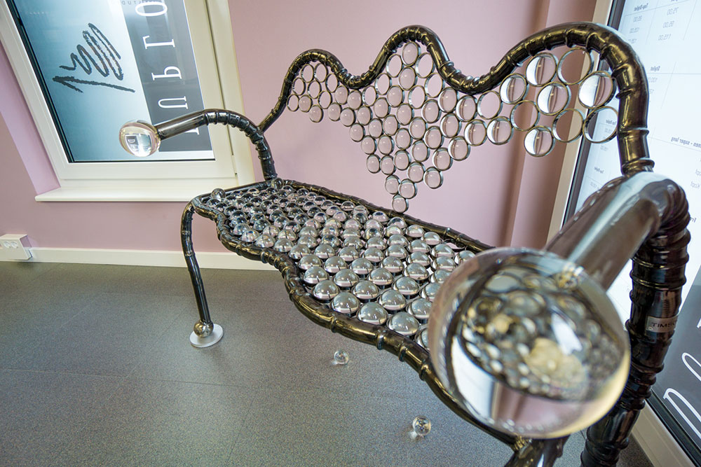 Diese einzigartige Sitzbank enthält insgesamt 179 Kristallkugeln. Davon 177 50mm Kugel und zwei 100 mm. Und damit bringt sie stolze 50 Kg auf die Waage. Einmaliger kann man wohl kaum sitzen.